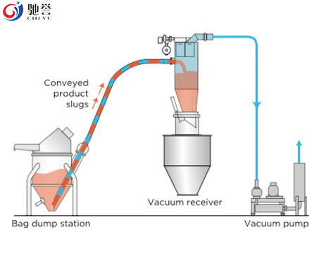 Granules or powder are sucked directly from container into mixing machine through conveyor pipe by vacuum.